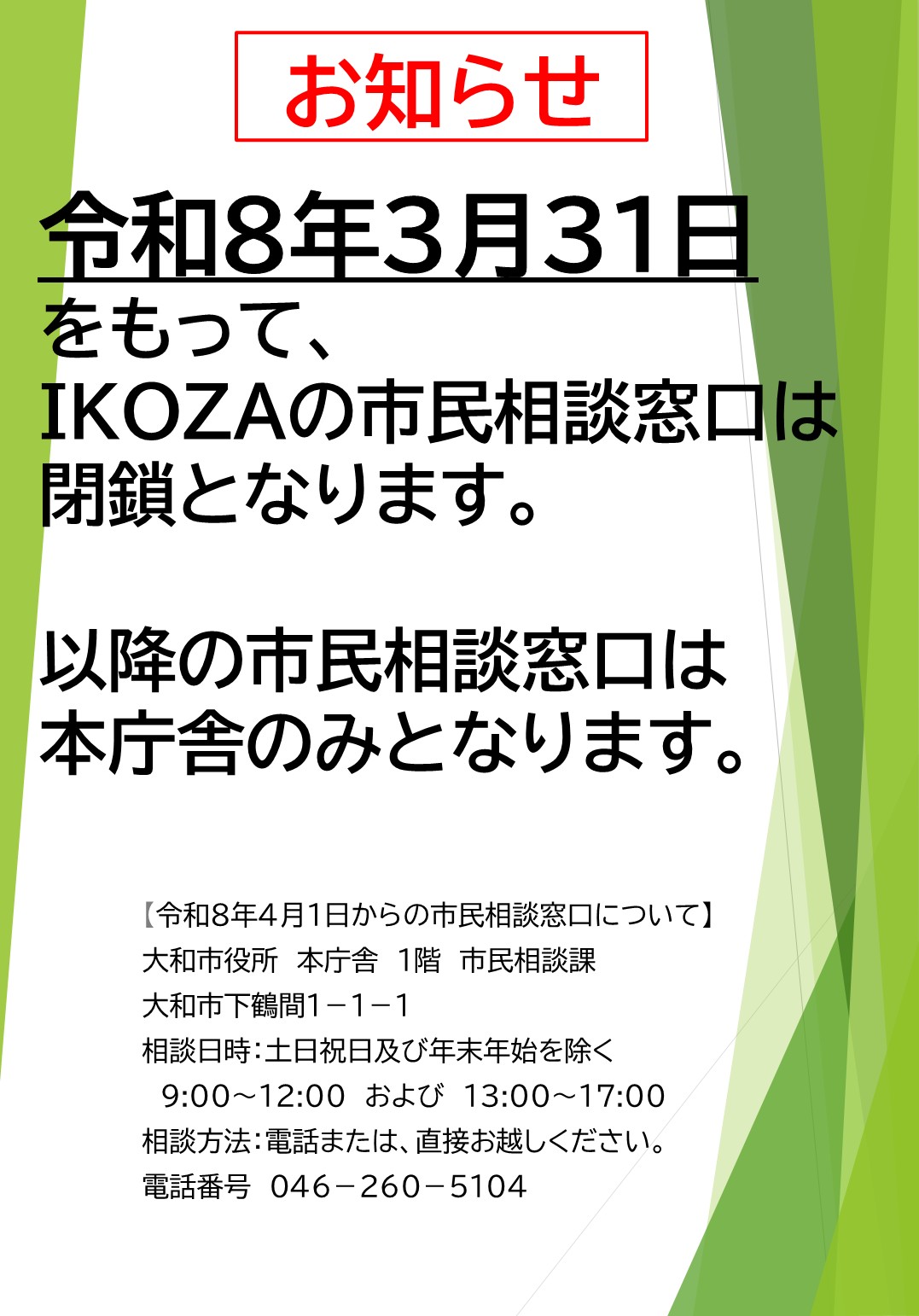 くらし・環境 くらし・環境 医療・健康福祉 医療・健康福祉 子育て・教育 子育て・教育 文化・スポーツ 文化・スポーツ しごと・産業・まちづくり しごと・産業・まちづくり 市政情報 市政情報 新着情報 What's New 2026年02月27日 令和8年3月31日をもって、IKOZAの市民相談コーナーは閉鎖となります。 2026年02月01日 ごみ収集職員を募集します 2026年01月30日 県央4市連携ピースプロジェクト・令和7年度 大和市平和都市推進事業戦後80年メイン事業「被爆体験記朗読会」を開催します 2026年02月25日 令和8年2月市長定例記者会見 2026年01月09日 市長の名前等をかたるLINEやメールにご注意ください 新着情報一覧を見る 災害・危機 救急医療 くらし・環境 くらし・環境を開く 医療・健康福祉 医療・健康福祉を開く 子育て・教育 子育て・教育を開く 文化・スポーツ 文化・スポーツを開く しごと・産業・まちづくり しごと・産業・まちづくりを開く 市政情報 市政情報を開く よく使われているページ Commonly Used Page 手続き案内 オンライン予約・ 混雑状況 ごみの出し方 コミュニティバス マイナンバー 広報 市民の掲示板 サークル会員募集 職員採用 テーマから探す Search by Theme 妊娠・出産 子育て 入園・入学 結婚 就職 引っ越し おくやみ 高齢者 健康 楽しむ・学ぶ 大和の魅力 大和市インフォメーション Yamato City Information 大和市議会 市長のページ 組織の紹介 基地対策 公共施設 大和市の地図情報 大和市立病院 市へのご提案・お問合せはこちら ピックアップ Pick Up 市民の掲示板・サークル会員募集 シリウス 記者会見・プレスリリース ふるさと納税 市民参加(パブコメ等) 人口・世帯数 総人口 245,016人 世帯数 118,894世帯 令和8年2月1日現在 統計情報を見る 大和市公式SNS