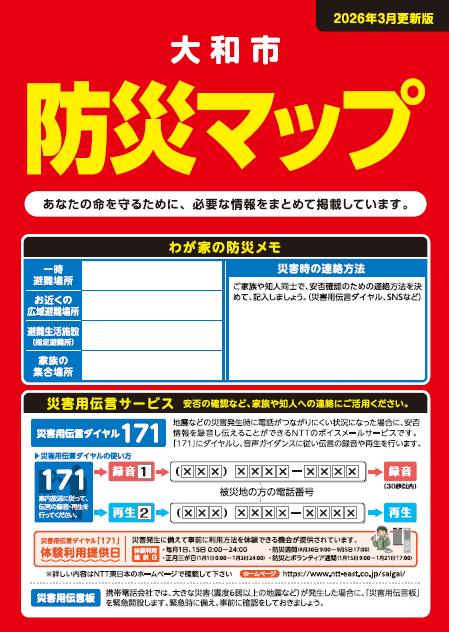 くらし・環境 くらし・環境 医療・健康福祉 医療・健康福祉 子育て・教育 子育て・教育 文化・スポーツ 文化・スポーツ しごと・産業・まちづくり しごと・産業・まちづくり 市政情報 市政情報 新着情報 What's New 2026年03月09日 「大和市防災マップ」をリニューアルしました。 2026年02月27日 「広報やまと」令和8年3月号(No.1347)を発行しました 2026年02月27日 令和8年3月31日をもって、IKOZAの市民相談コーナーは閉鎖となります。 2026年02月01日 ごみ収集職員を募集します 2026年01月30日 県央4市連携ピースプロジェクト・令和7年度 大和市平和都市推進事業戦後80年メイン事業「被爆体験記朗読会」を開催します 2026年01月09日 市長の名前等をかたるLINEやメールにご注意ください 新着情報一覧を見る 災害・危機 救急医療 くらし・環境 くらし・環境を開く 医療・健康福祉 医療・健康福祉を開く 子育て・教育 子育て・教育を開く 文化・スポーツ 文化・スポーツを開く しごと・産業・まちづくり しごと・産業・まちづくりを開く 市政情報 市政情報を開く よく使われているページ Commonly Used Page 手続き案内 オンライン予約・ 混雑状況 ごみの出し方 コミュニティバス マイナンバー 広報 市民の掲示板 サークル会員募集 職員採用 テーマから探す Search by Theme 妊娠・出産 子育て 入園・入学 結婚 就職 引っ越し おくやみ 高齢者 健康 楽しむ・学ぶ 大和の魅力 大和市インフォメーション Yamato City Information 大和市議会 市長のページ 組織の紹介 基地対策 公共施設 大和市の地図情報 大和市立病院 市へのご提案・お問合せはこちら ピックアップ Pick Up 市民の掲示板・サークル会員募集 シリウス 記者会見・プレスリリース ふるさと納税 市民参加(パブコメ等) 人口・世帯数 総人口 244,978人 世帯数 118,954世帯 令和8年3月1日現在 統計情報を見る 大和市公式SNS