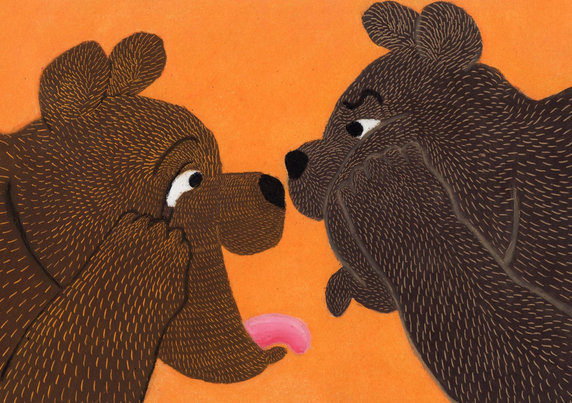 2頭のクマがにらめっこをしているだけのシンプルな絵柄。背景のオレンジが潔く、2頭を際立たせている。細かく描きこまれた毛並みの描線がイラストに動きを与えていて、ユーモラスなにらみ合いが表情豊かな一コマになっている。見ていると元気になってくる作品。