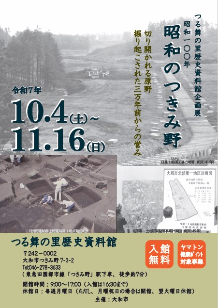 つる舞の里歴史資料館が所在するつきみ野地区は、昭和40年から東京急行鉄道株式会社が行った大規模開発によって景観が大きく変わりました。また、工事に伴い発見された月見野遺跡群の調査は、3万年前からこの地域で生活を営んだ人類の長い歴史を明らかにしました。