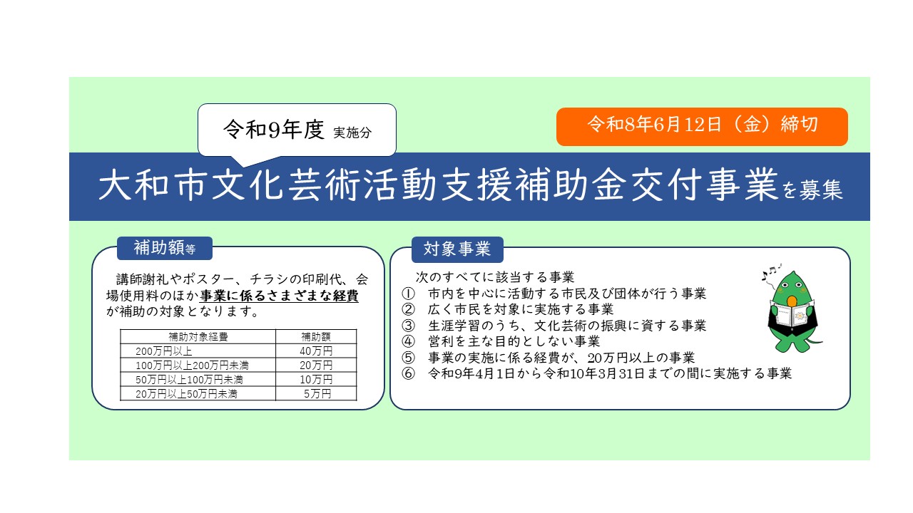 - 令和8年6月12日(金曜日)までに、補助金要望書類(要望書、計画書、予算書)を直接文化振興課へ提出してください。※申請書提出前に来庁日時をお電話でご連絡ください。※郵送では受付できません。