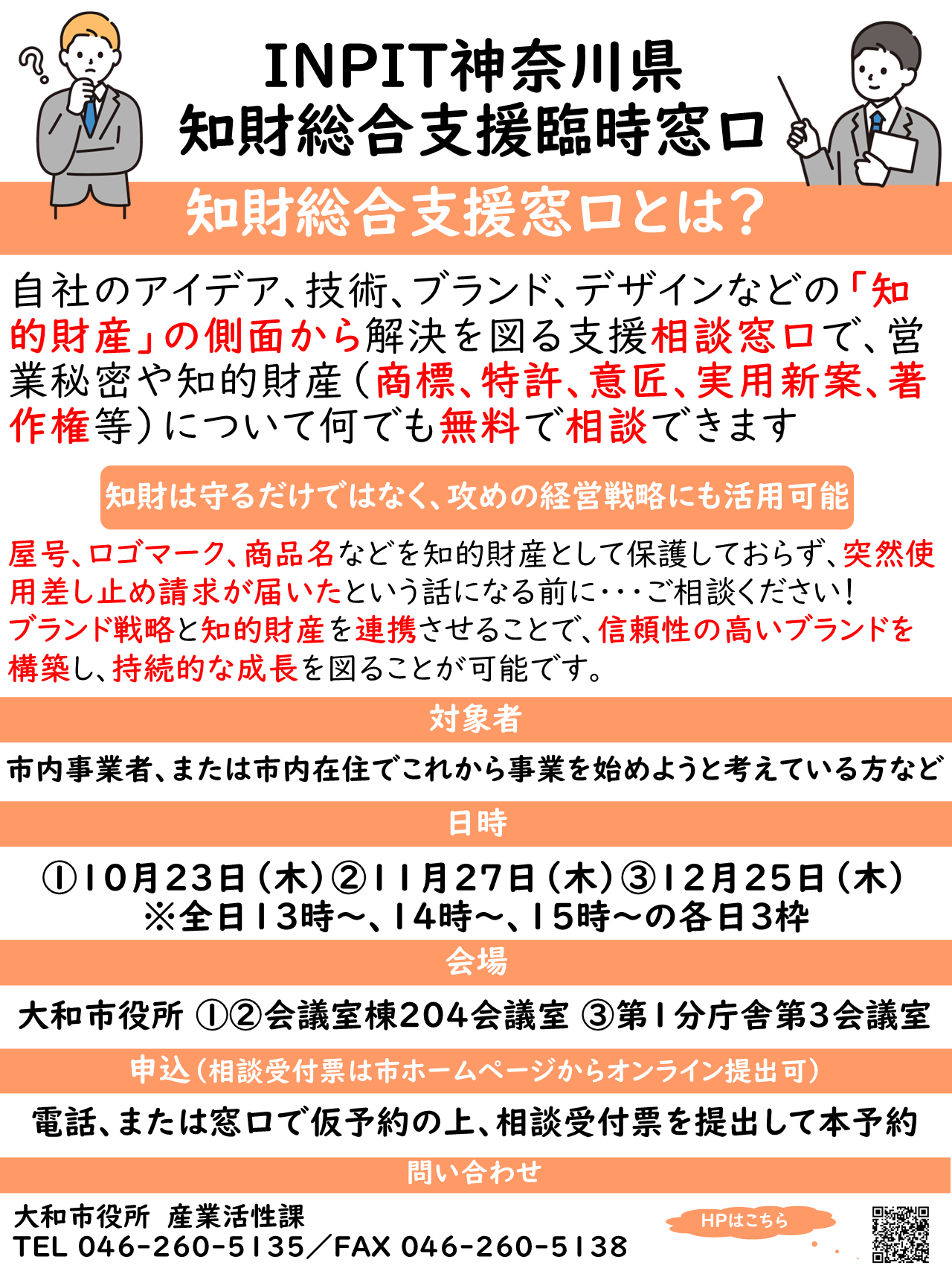 - お電話(産業活性課 046-260-5135)にて、上記開催日程の中から、ご希望の時間を仮予約ください。