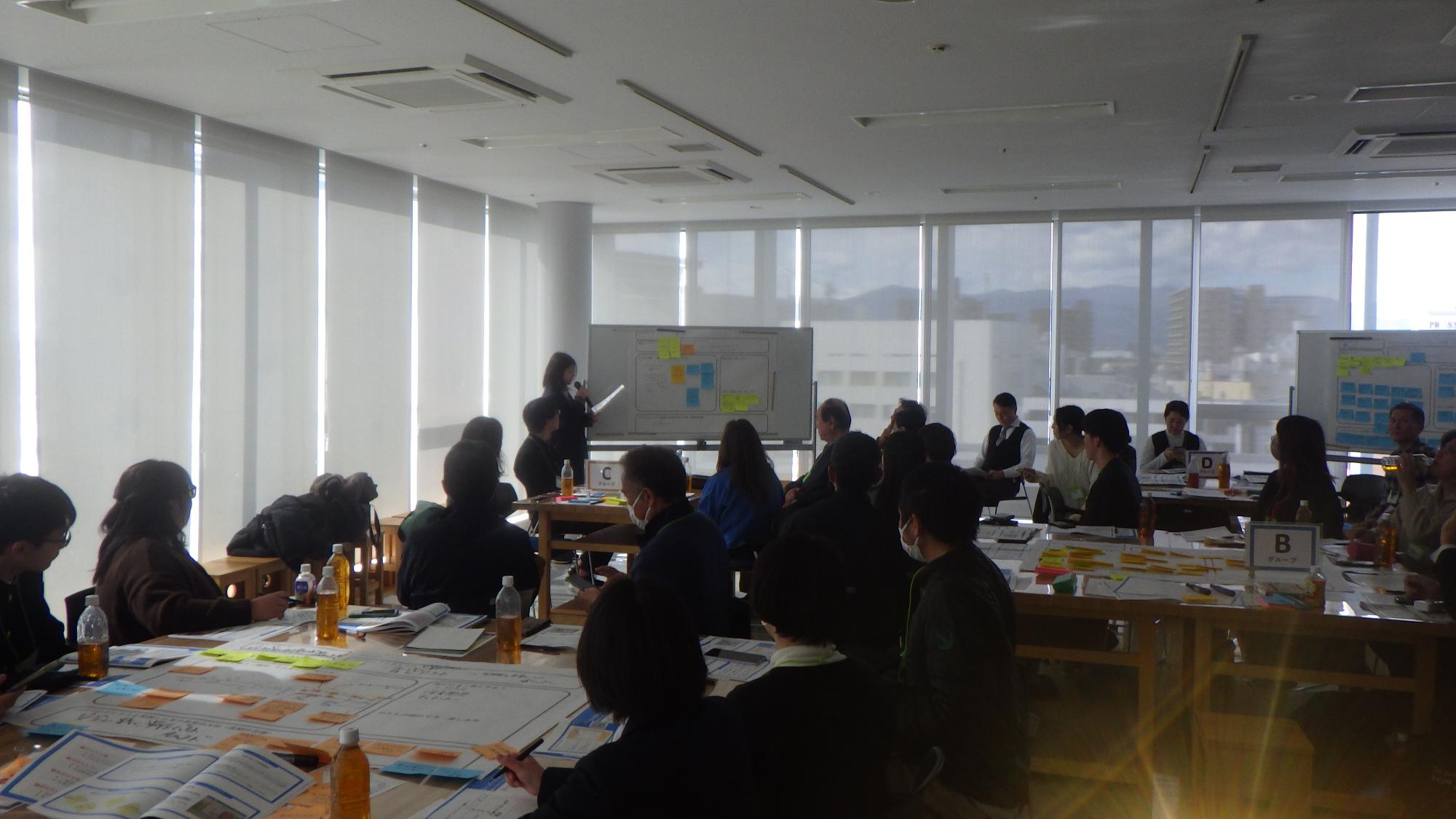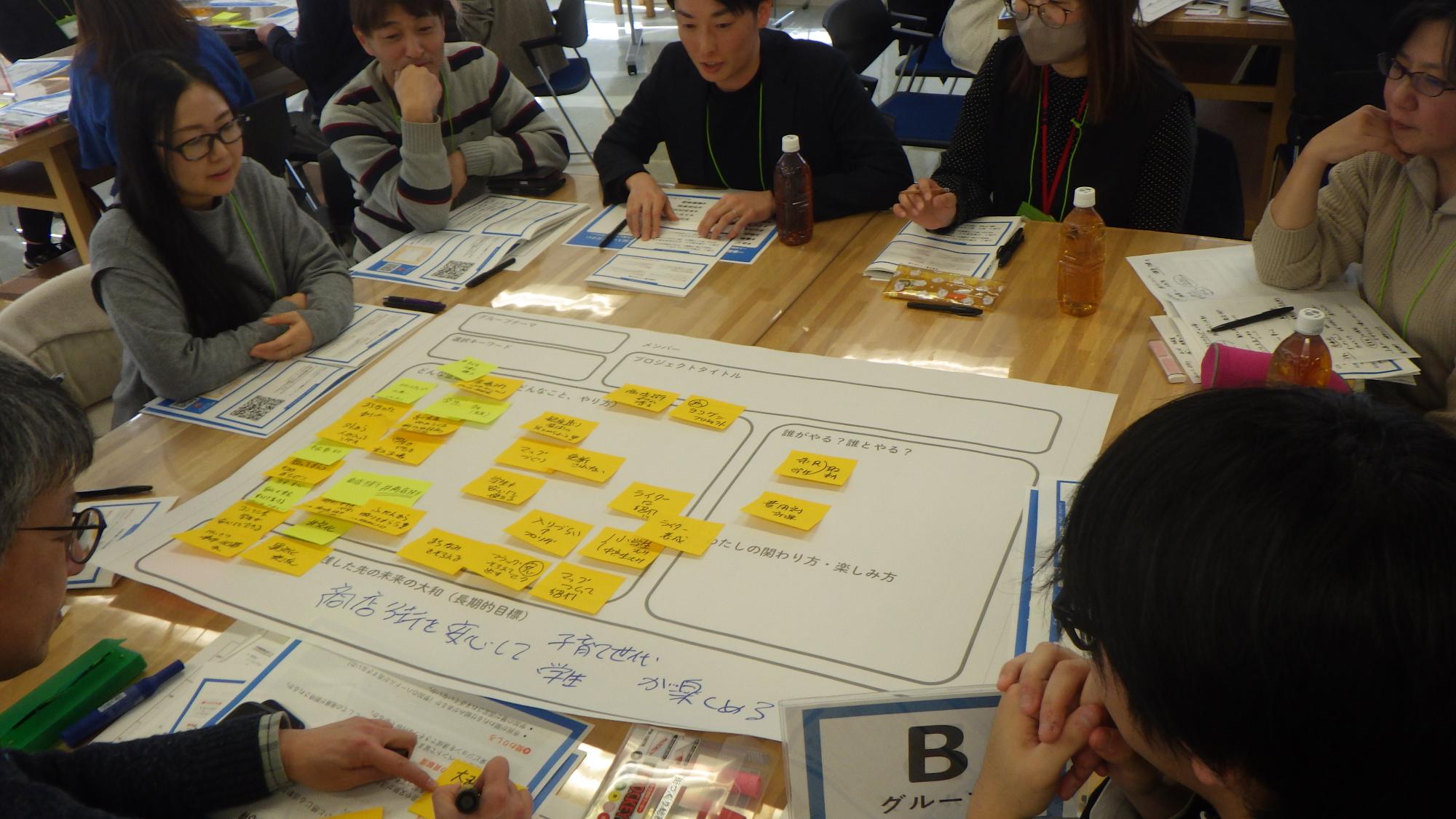 令和8年1月25日に文化創造拠点シリウス612文化創造室において、大和駅周辺のこれからを考える「みんなで会議」を開催しました。当日は、一般参加・職員併せて28人が参加しました。大和駅周辺エリアプラットフォーム準備会で検討を進めている、大和駅周辺をもっと過ごしやすく、訪れたくなる場所にするための「未来ビジョン」に対して、どんな関わり方ができるか、4つのグループに分かれてプロジェクトを提案しました。最後は、全体発表で、アイデアを共有しました。