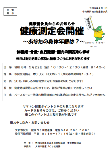中央林間地区 健康普及員からのお知らせ Tweet 更新日:2025年12月24日 開催予定の教室 令和8年5月22日(金曜日) 健康測定会 4月1日より申し込みを受付しています。 申し込み方法 下記の方法でお申し込みください。 ・電話(健康づくり推進課 046-260-5663) この記事に関するお問合せ先 健幸・スポーツ部 健康づくり推進課 地域保健活動係〒242-8601 大和市鶴間1-31-7 (保健福祉センター別館3階 案内図)電話:046-260-5663お問合せフォーム