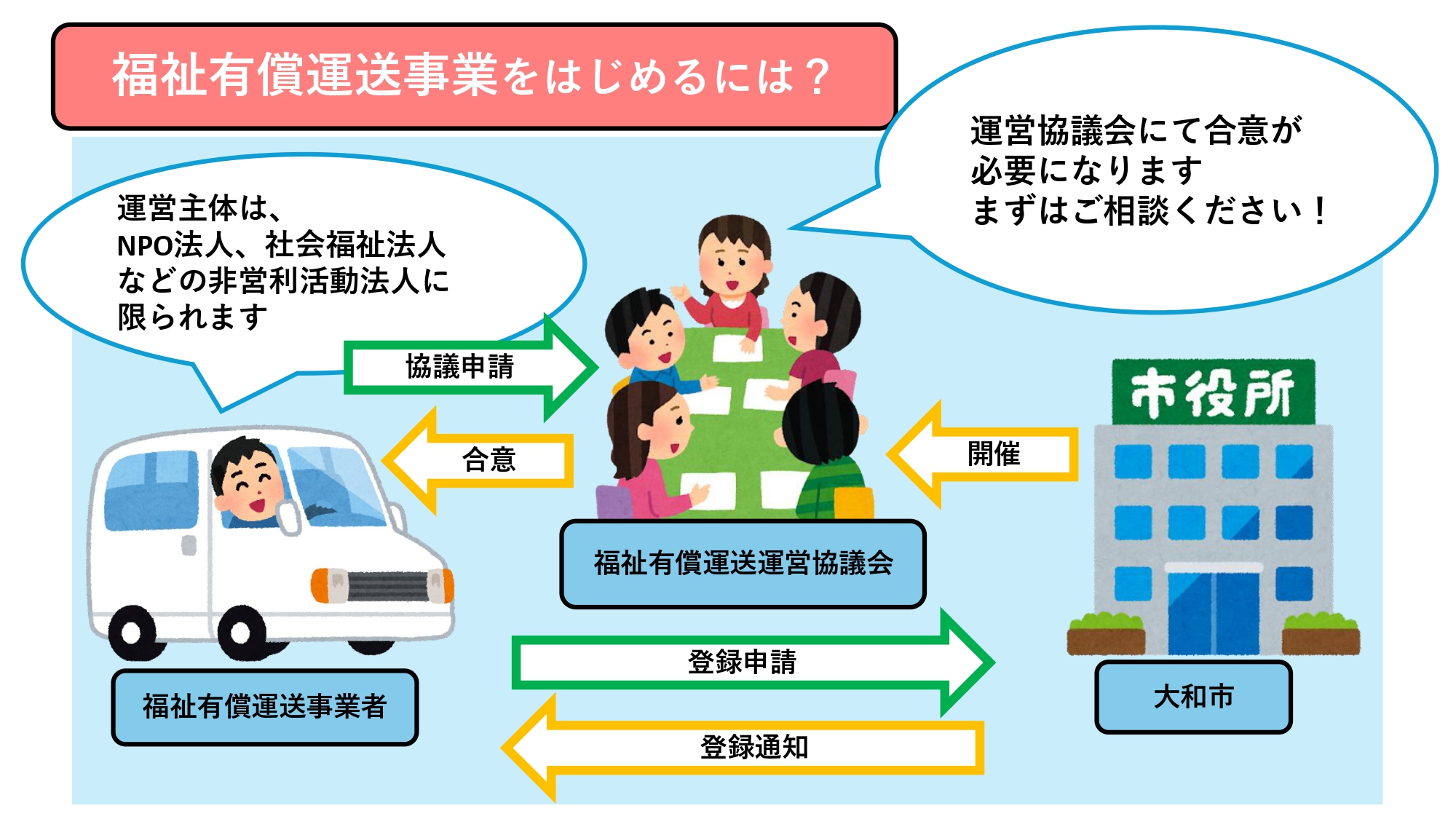 福祉有償運送を行うことができるのは、NPO法人のほか、公益法人、農業協同組合、消費生活協同組合、医療法人、社会福祉法人、商工会議所、商工会等で、事業実施にあたっては、本市または運輸支局長等の登録を受けなければなりません。また、登録の申請にあたっては、市町村等が主宰する「(注釈)運営協議会」において、福祉有償運送の必要性、運送の区域、旅客から収受する対価等について合意されていることが必要です。(注釈)運営協議会については、下記「運営協議会について」をご覧ください。