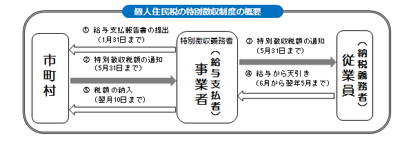 市・県民税の特別徴収とは、従業員の方の市・県民税を事業者の方が毎月の給料の支払い際に、所得税と同じように給料から差し引いて徴収し、市町村へ納入していただく仕組みのことをいいます。