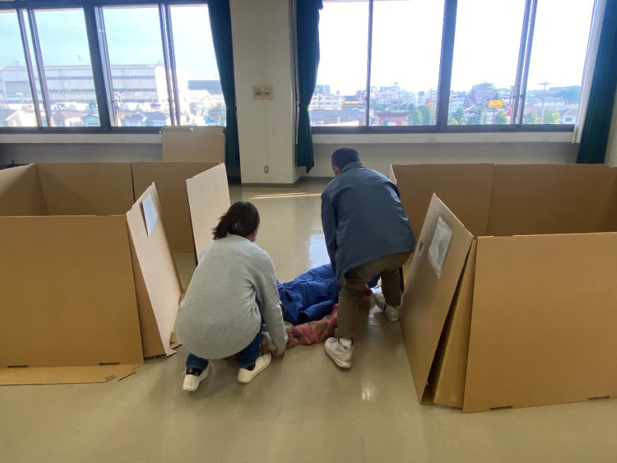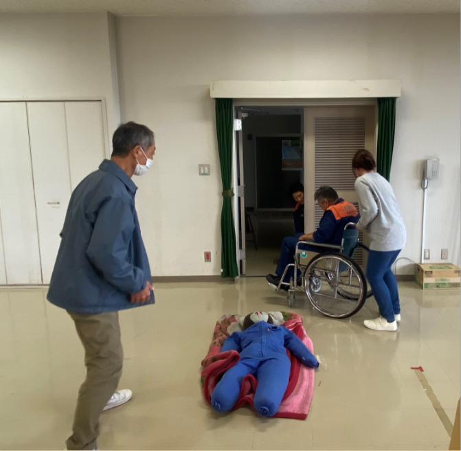 参加者は模擬施設で火災を想定した訓練を実施しました。寝たきりの入居者を協力して愛護的に搬送しているところです。