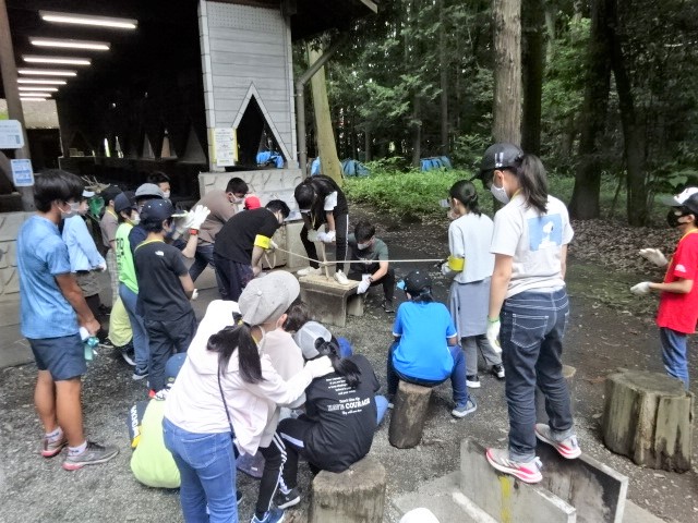 大和市からおよそ1時間半かけて千葉県君津市にある「君津亀山青少年自然の家」に行きました。新型コロナウィルス感染防止のため、カレー作りなどの野外炊事は行えませんでしたが、参加者のみなさんはキャンプファイヤー、森のビンゴ、森の清掃活動、葉っぱのたたき染めエコバッグ作りなど、自然に囲まれた環境の中で、様々な体験を行うことができました。参加者からは、「みんなと過ごせて楽しかった!」「まだ帰りたくない!」という声がたくさん聞かれました。