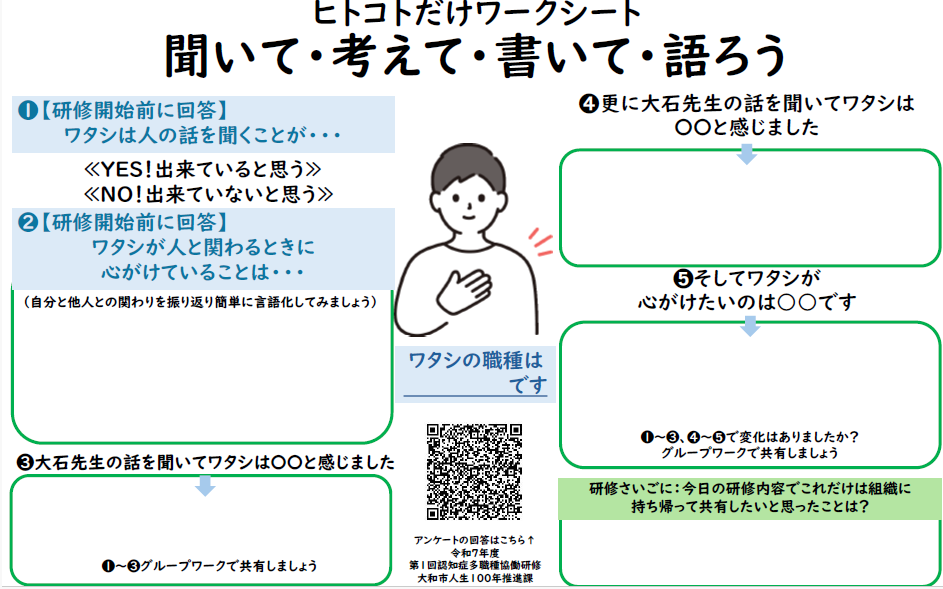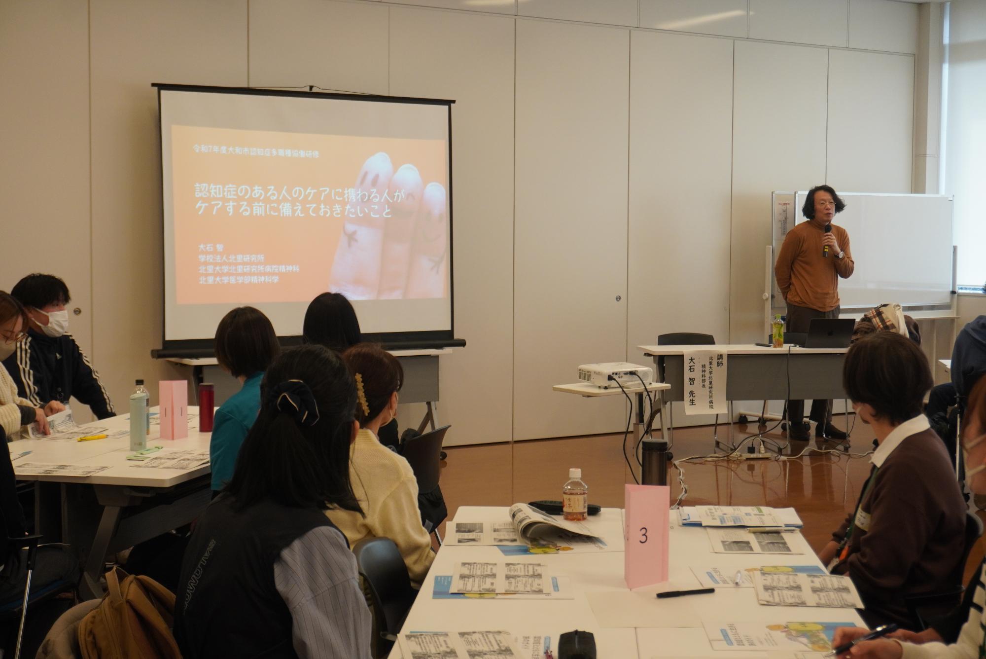 令和7年度第1回認知症多職種協働研修は北里大学北里研究所病院 精神科部長の大石 智先生を講師としてお迎えし、「自分の中にある認知症に対する先入観やスティグマ(偏見)が認知症のある人との"へだたり”を生じさせる一因になっていないか」をテーマにこれまでの自分のかかわり、ケアを振り返り、この先の支援を考えることを目標に実施しました。