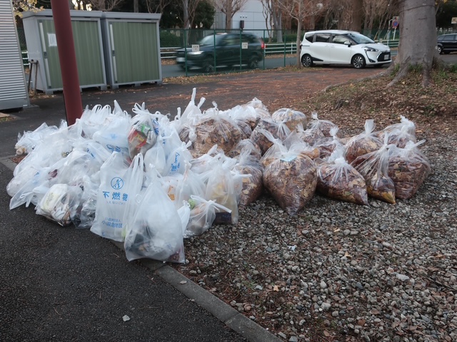 集められたごみの総量は約156kgとなりました。内訳は、燃えるゴミが約13kg、燃えないゴミ約15kg、びん・缶約7kg、ペットボトル約3kg、たばこの吸い殻約2kg、落ち葉約116kgでした。