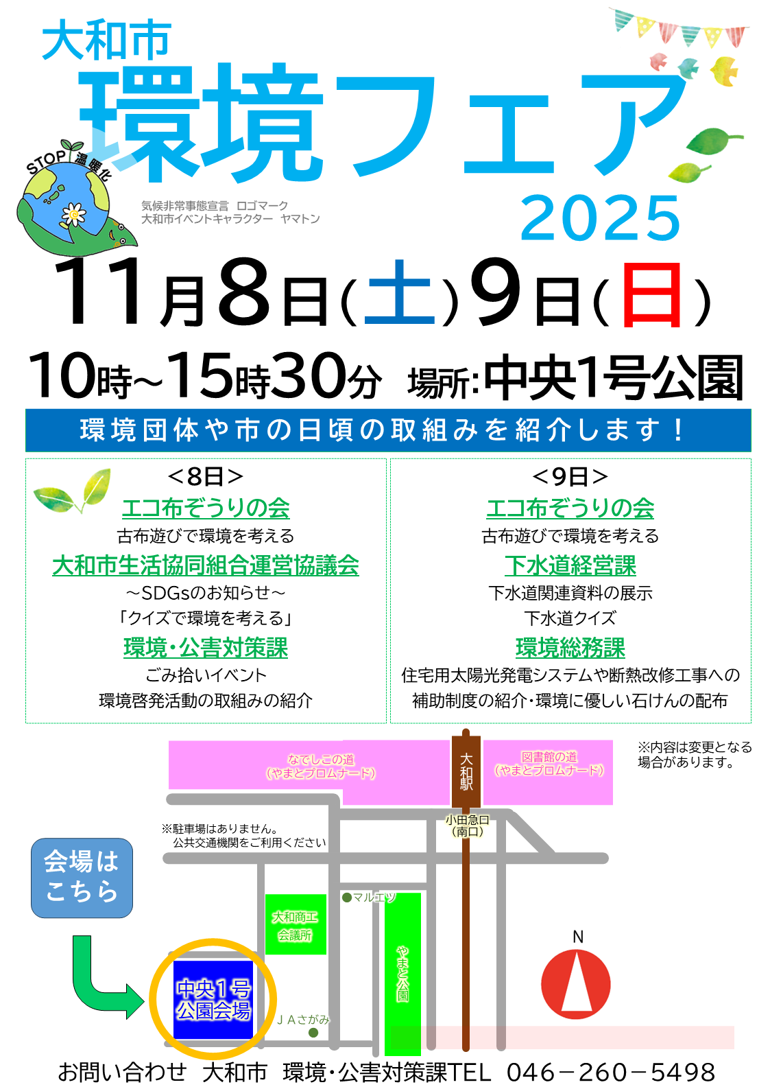 今年度は、11月8日(土曜日)、11月9日(日曜日)の2日間、大和市産業フェア2025に、大和市環境フェア2025として参加し、環境団体や市の日頃の取り組みの紹介を行います。
