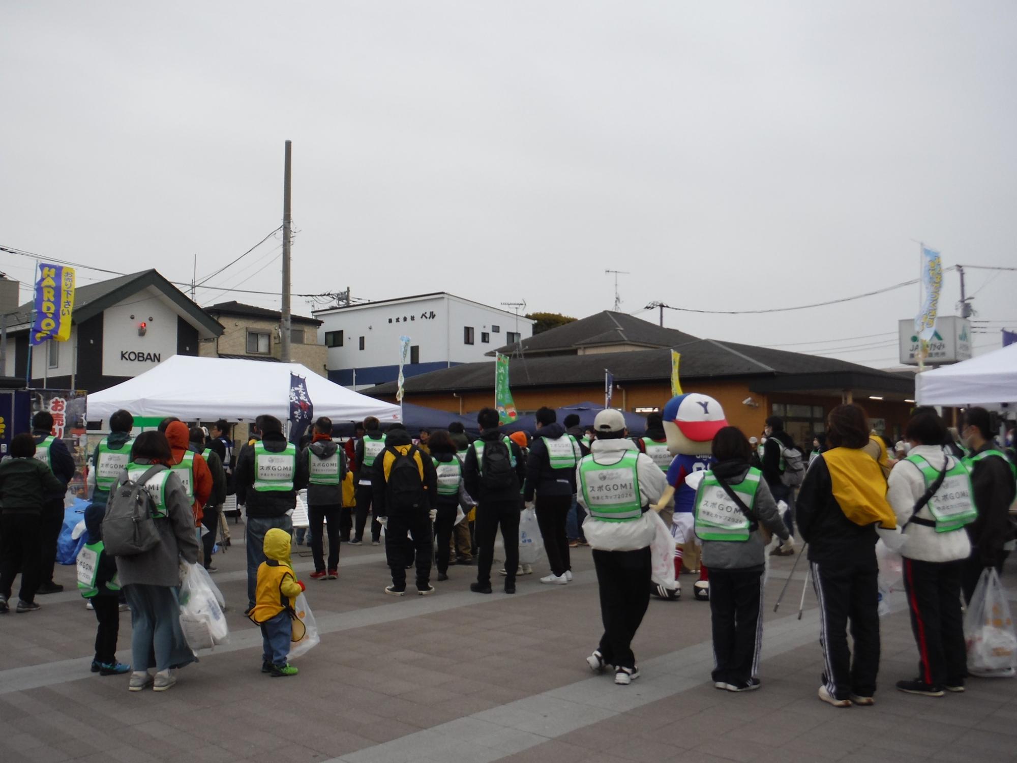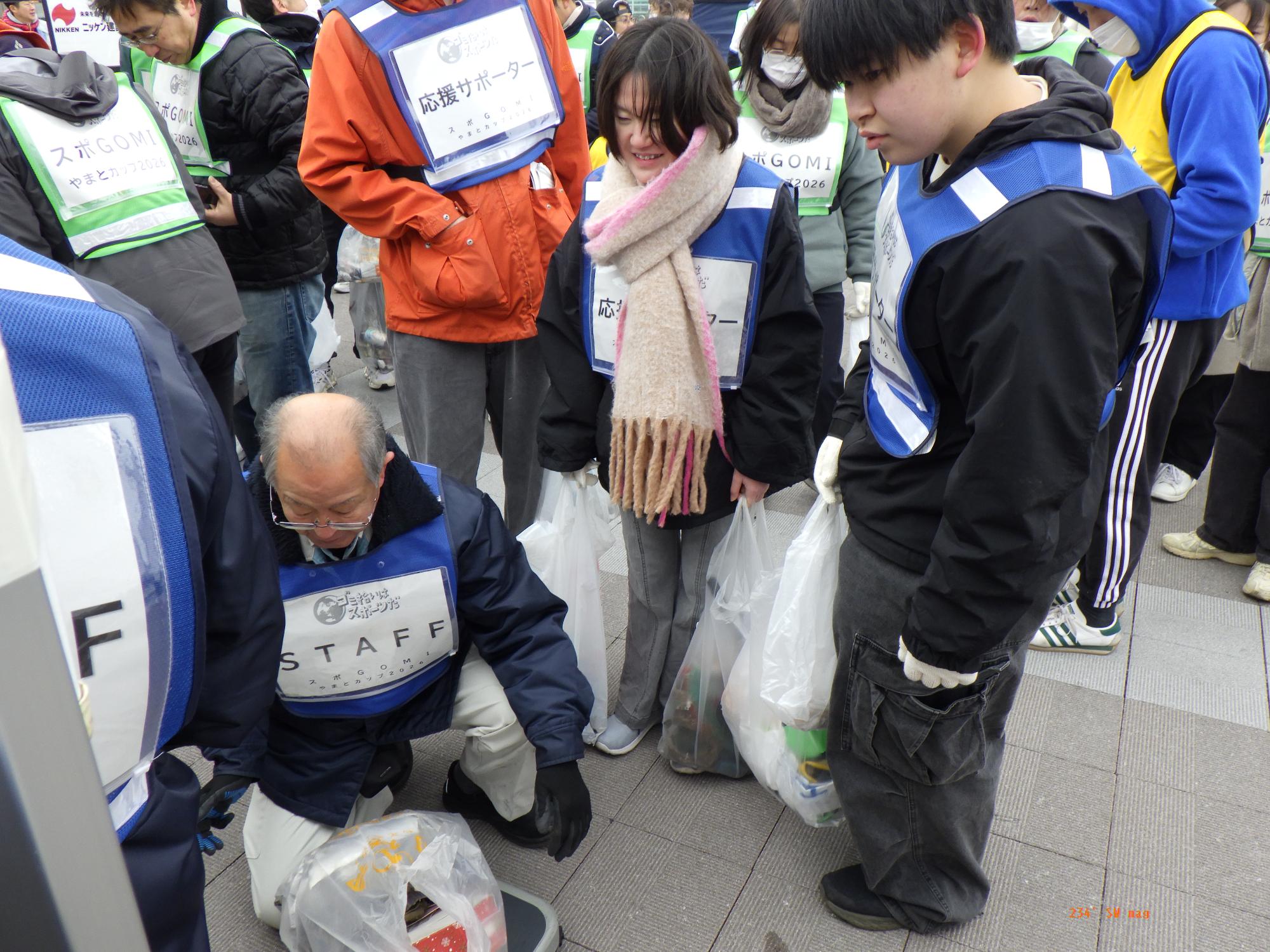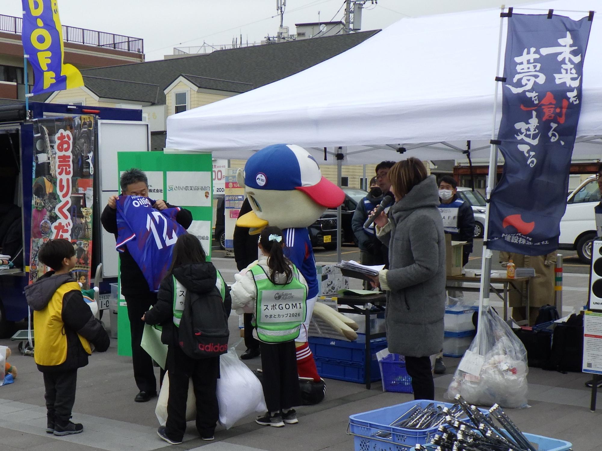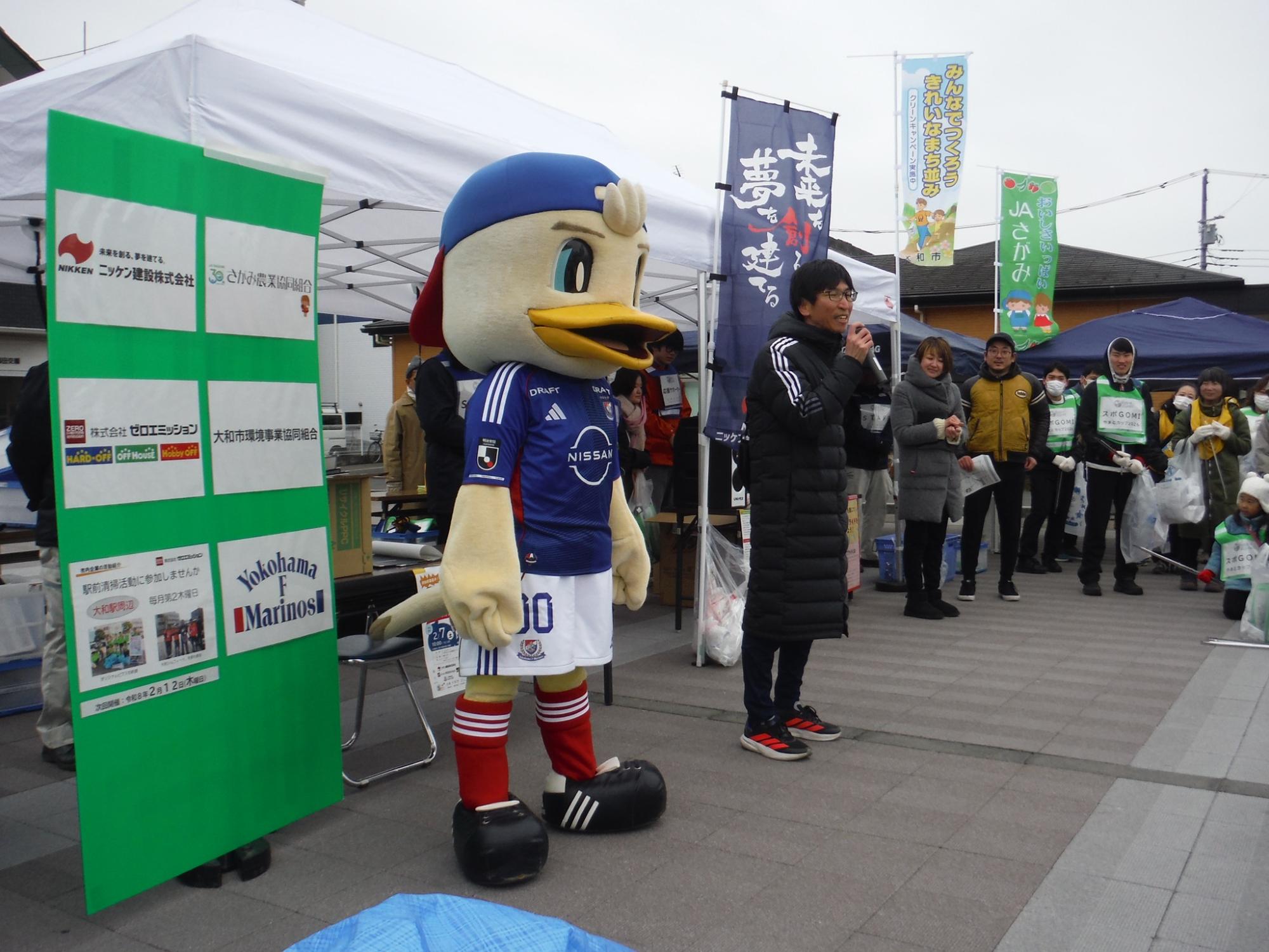 時おり小雪がちらつく厳しい寒さのなか、30チーム計117人が参加。なかでも高校生以下の参加者が約30名集まり、活気溢れる大会となりました。マリノスケが参加し、参加者と一緒にエリア内の清掃活動を行いました。また、大和高校生徒会が、応援サポーターとして参加し、清掃活動に加えて大会スタッフの役割を担いました。