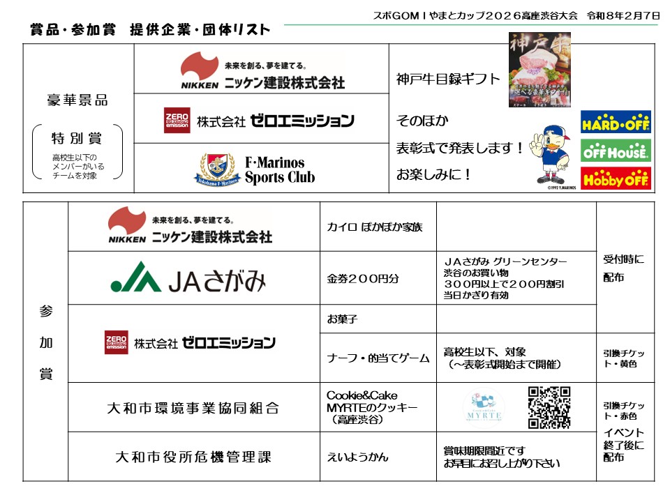 閉会式には、市長も駆けつけ、上位チームへの表彰を行いました。優勝チームには、賞品として、大和市代官に事業所を置くニッケン建設株式会社から神戸牛の豪華ギフトが贈られました。大和市をホームタウンとする横浜F・マリノス、リユース・リサイクルショップを展開する株式会社ゼロエミッションから特別賞が贈られたほか、さがみ農業協同組合(JAさがみ)、ニッケン建設株式会社、大和市環境事業協同組合から参加賞が贈られました。