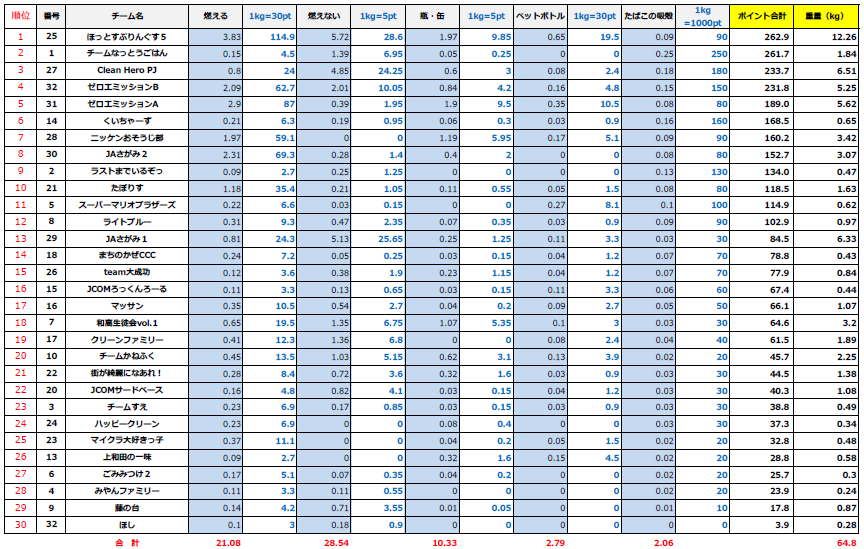 計量の結果、集められたごみの総量は、64.8キログラム。きれいに見える高座渋谷でしたが、予想以上のごみの量に、みんな驚いていました。なかでも、たばこの吸い殻が多かったという感想が多く聞かれました。
