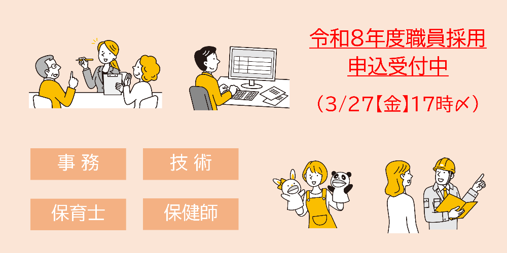 募集職種は、来年4月採用の区分で事務、建築、土木、電気、設備、保育士を募集します。