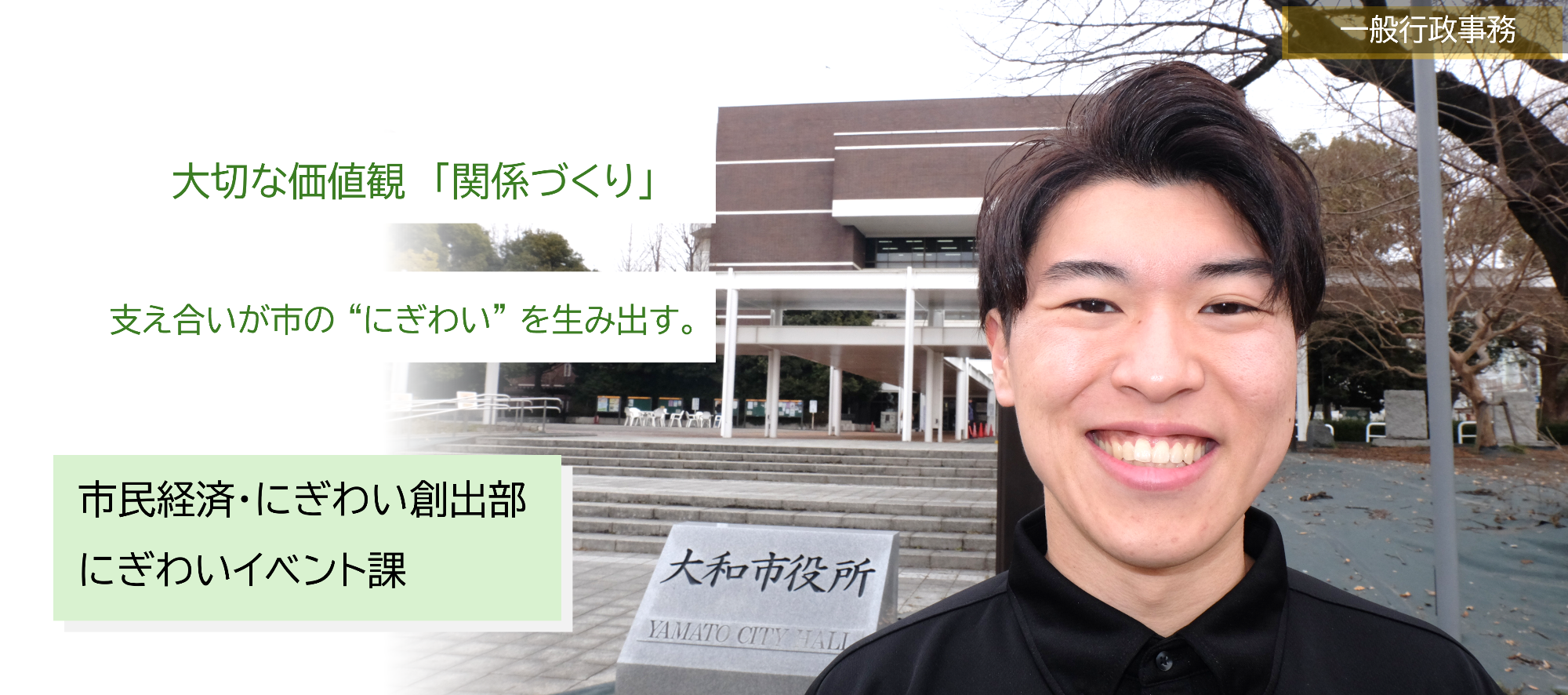 自分が生まれ育ったまちである大好きな大和市のために貢献したいと思い、入庁しました。市役所職員として働くことで、一生に渡って多くの人をサポートし、市民の生活をより良くしたいと思ったからです。