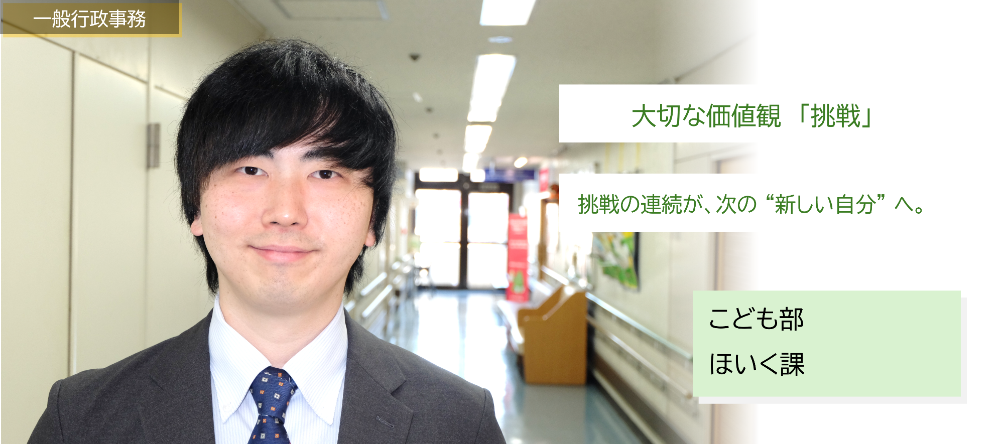 今までイベント企画・運営を行う部署、市民対応が多い部署、市役所内部に向けた業務が多い部署など、様々な部署を経験してきました。その中で、いかに早く新しい環境に溶け込み、業務に関する理解を深めるために「挑戦」する気持ちが大切だと思います。