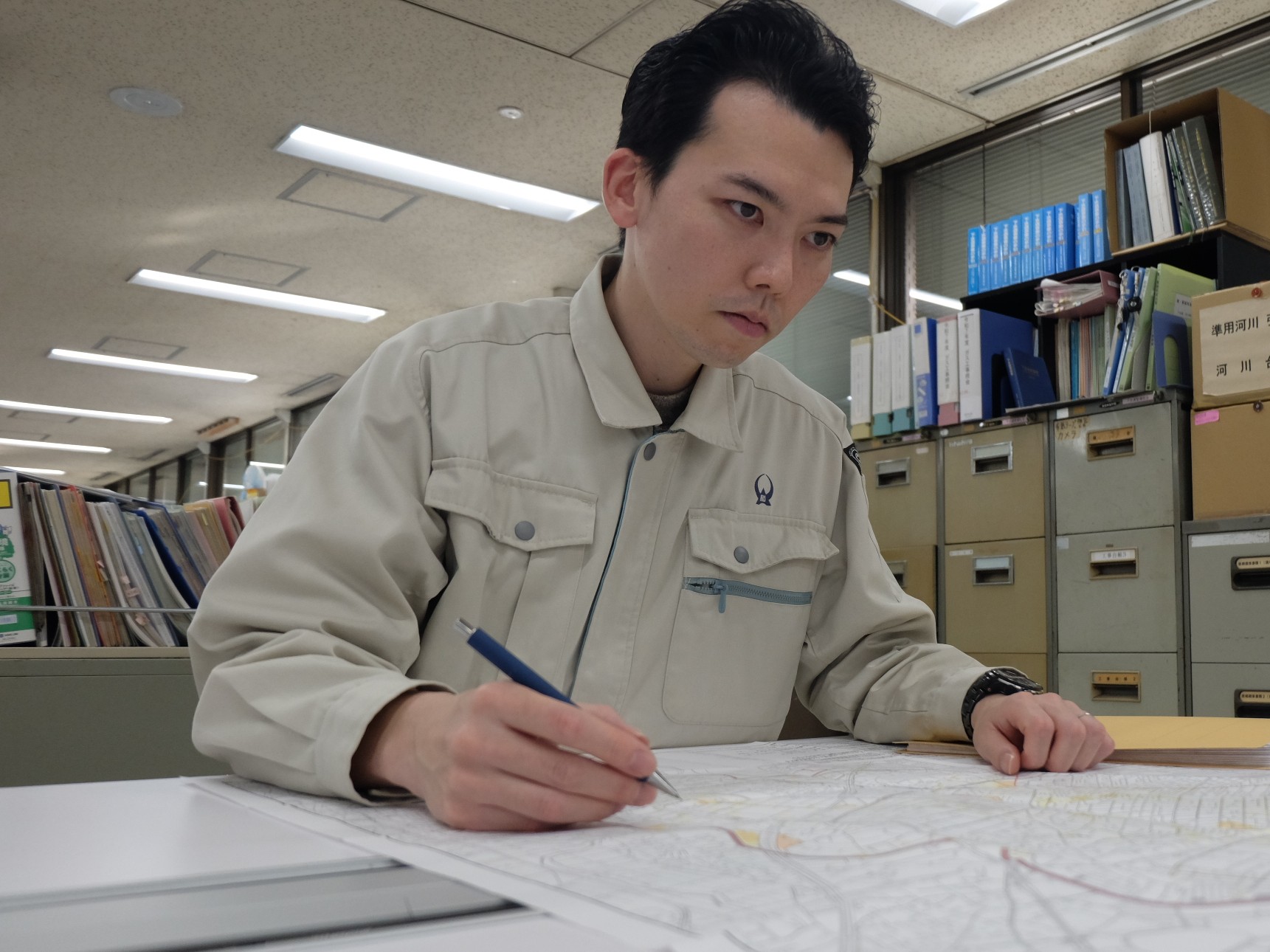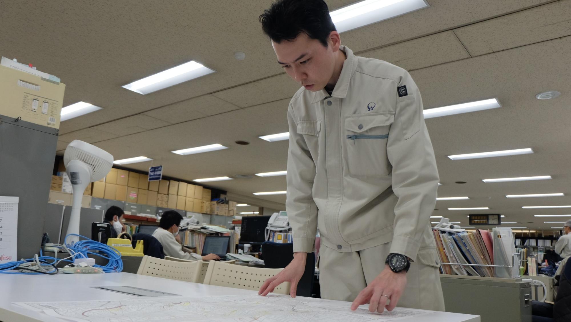 当課では土木職だけでなく、電気職、機械職など様々な職種の職員が在籍しており、経歴や年齢も幅広く、バラエティに富んだ人材で構成されています。各分野のスペシャリストがいるので、技術的な課題も職場内で相談することで解決に繋がることが多いです。