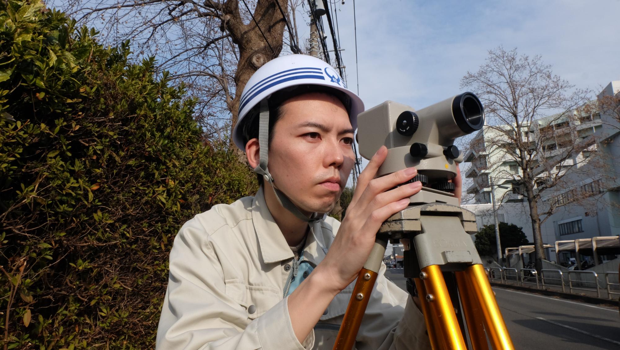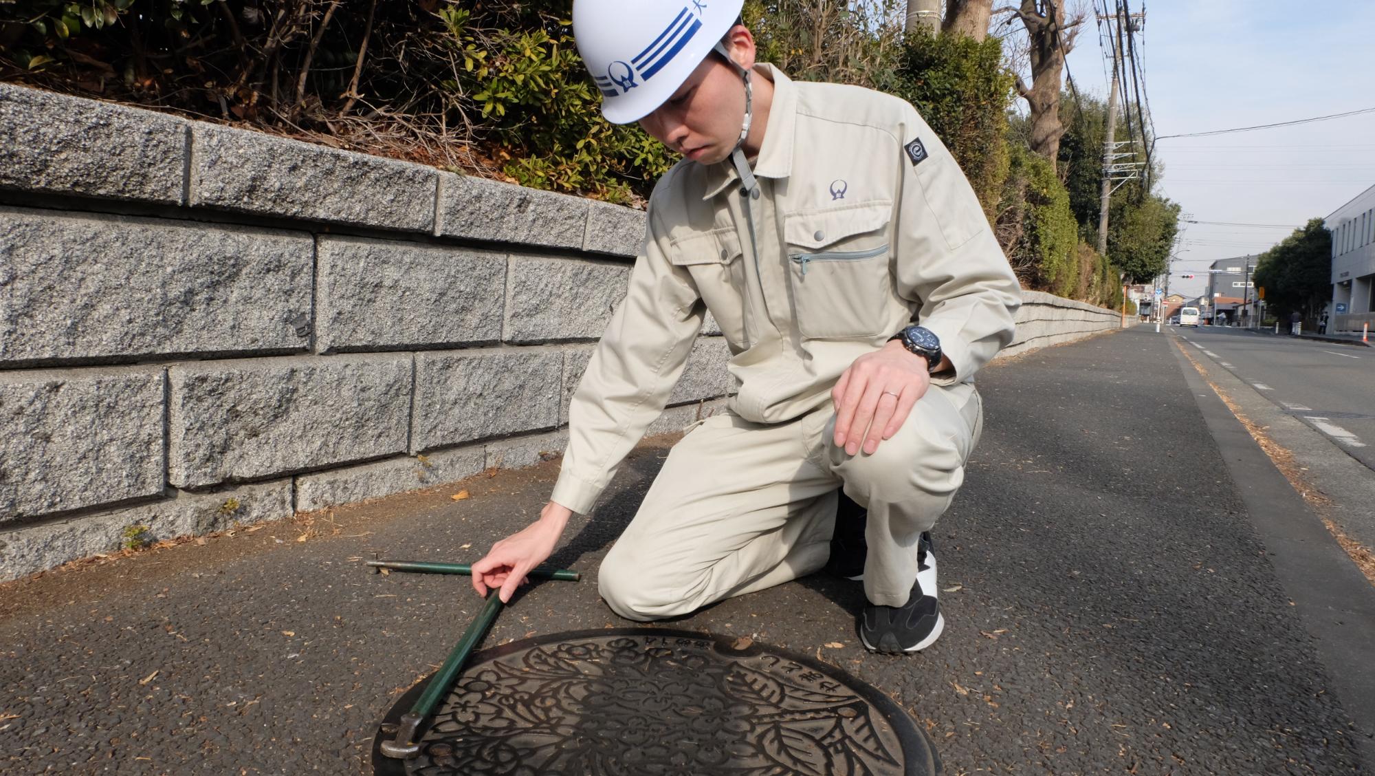 私が主に担当するのは下水道管の工事で、職場の仲間と共に計画、測量、設計、工事監督、点検と上流から下流まで全ての工程に携わっています。