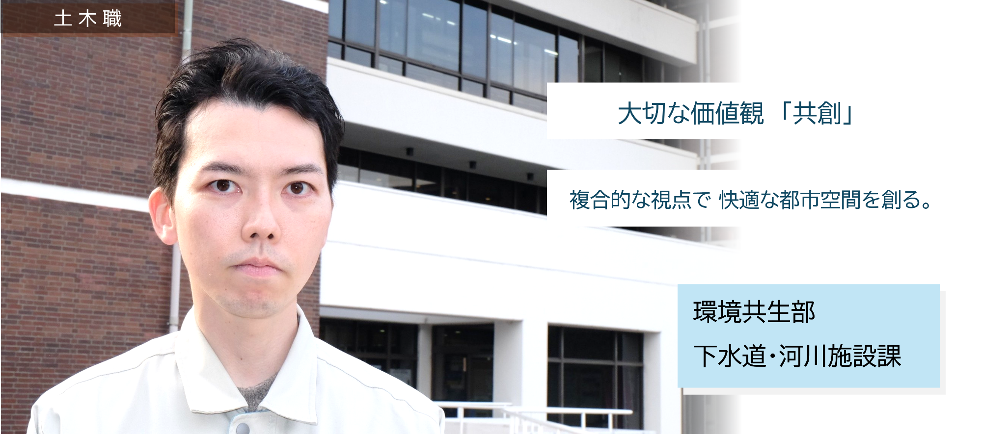 市が整備する土木構造物は公共のものであり、様々な方が快適に利用するためには、職員ひとりの視点だけでは充分なものは作れないと考えています。個人ではなくチームで方針を定め、市民の意見に耳を傾け、施工業者などと協議を重ねることで初めて、環境に調和したインフラや快適な都市空間の整備が出来るのではないでしょうか。