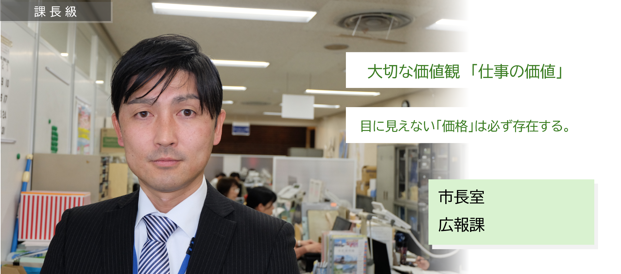 行政の仕事は、市場価値で測れないものがほとんどですが、一方で、市民の皆様の税金によって運営されているため、目に見えない「価格」は必ず存在します。このため、自分の仕事に対して、市民の皆さんが価値を感じてくれるのかを常に考えています。