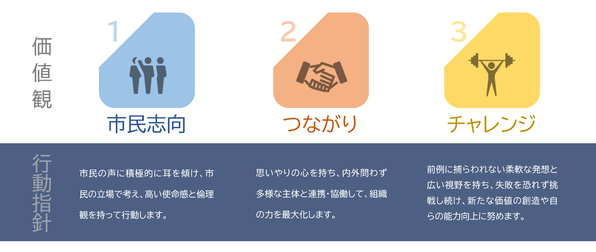 市民のウェルビーイング向上を実現するためには、職員に求められる価値観を全体で共有し、自らの意思や判断で業務を進めていく場面において、この価値観に基づき「自分ごと」として向き合っていく必要があります。