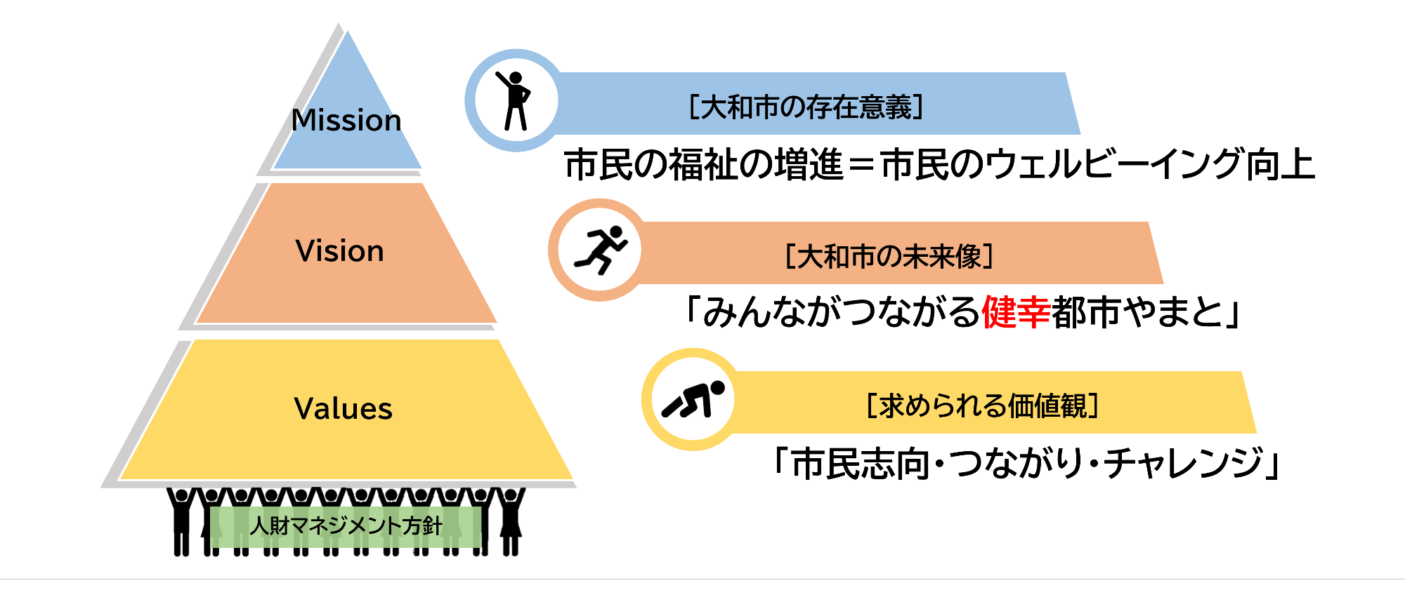 大和市は、令和7年4月に組織の存在意義や理念・価値観を示す、「大和市人財マネジメント方針」を掲げ、職員全員に対して、組織の目指すべき方向性を言語化して伝え、同じベクトルを向いて一丸となることを目的としてこちらの図を作成しました。
