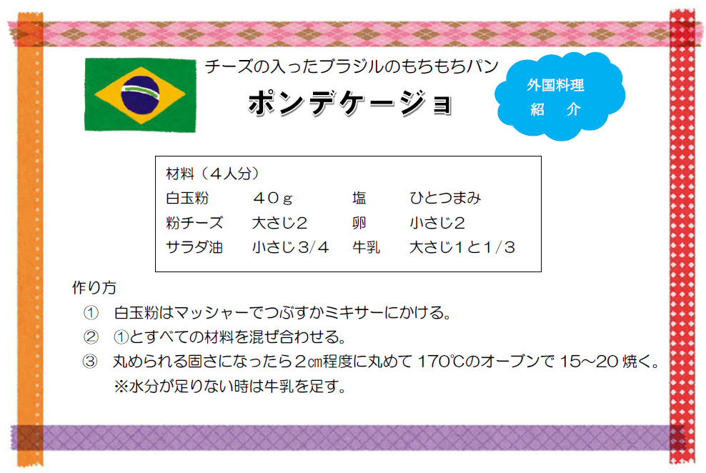 【日本の味噌汁】 【フランスのグラタン】 【韓国のビビンバ】 【フランスのシチュー】 【イタリアのピザ】 【タイのガパオライス】 【インドのタンドリーチキン】 【ネパールのチャウミン】 【オランダのドーナツ】 【韓国のチャプチェ】 【中国の麻婆豆腐】 【ハワイのロコモコ】 【ブラジルのポンデケージョ】 【中国の酢豚】 【トルコのかぼちゃグラッセ】